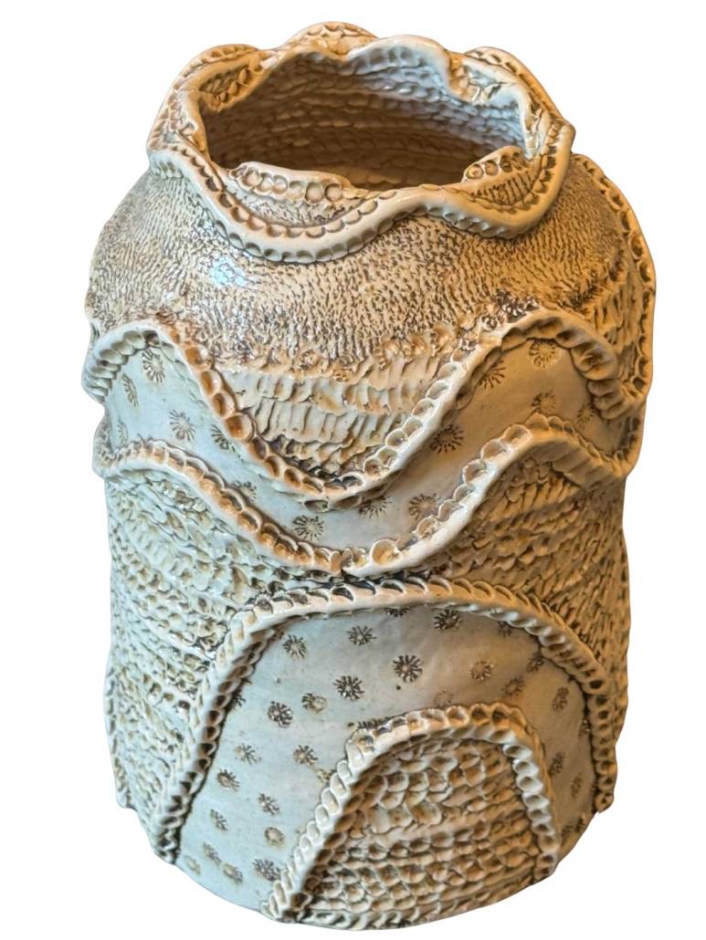 Several years later I found Brian Hallstead’s home studio. Here, I continued with hand-construction, making plates, birdhouses, vessels, and tiles. I learned a lot from Brian’s technical skills.