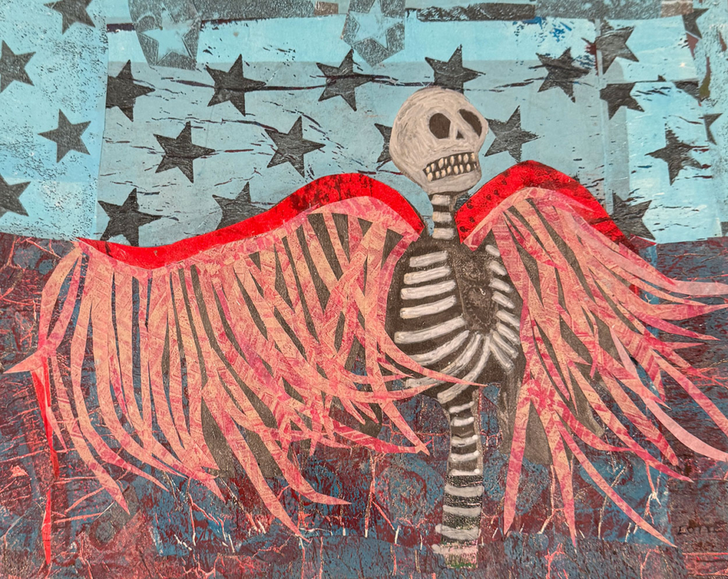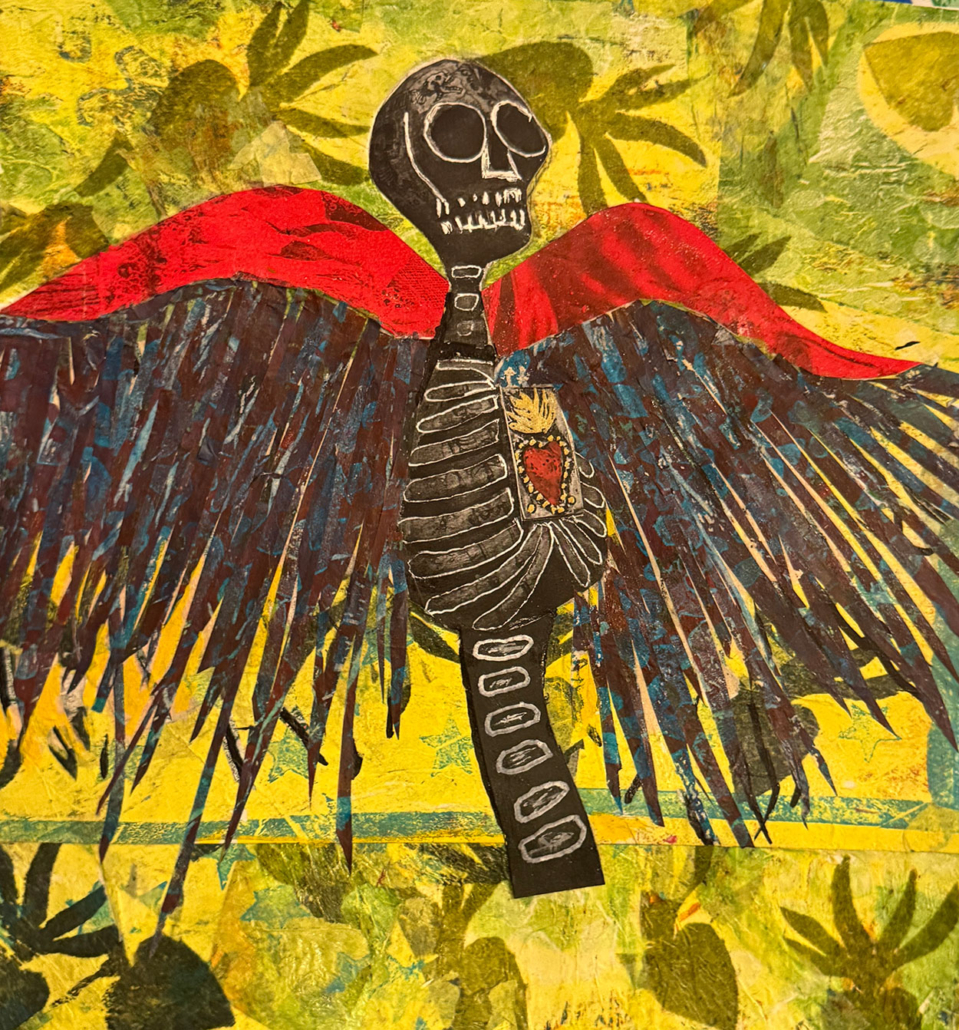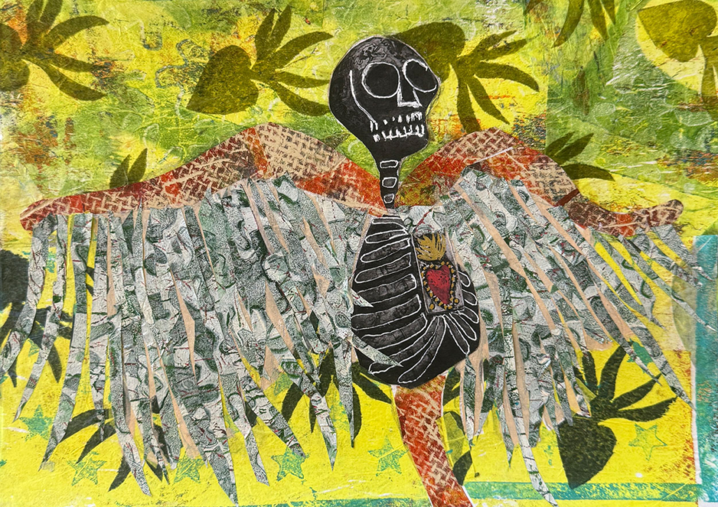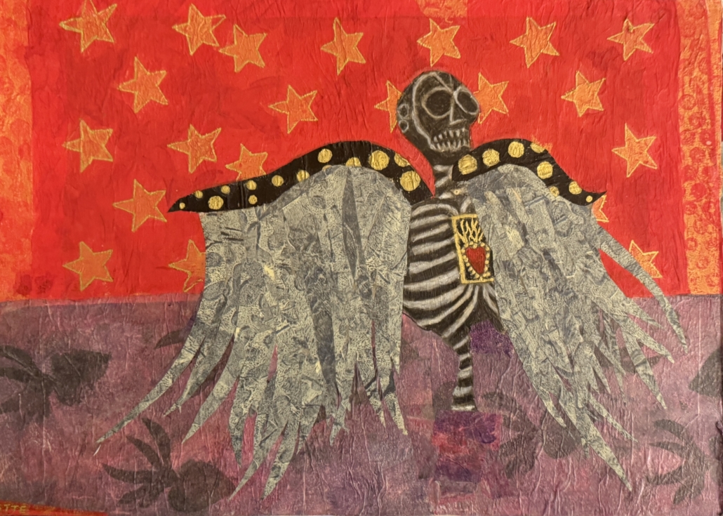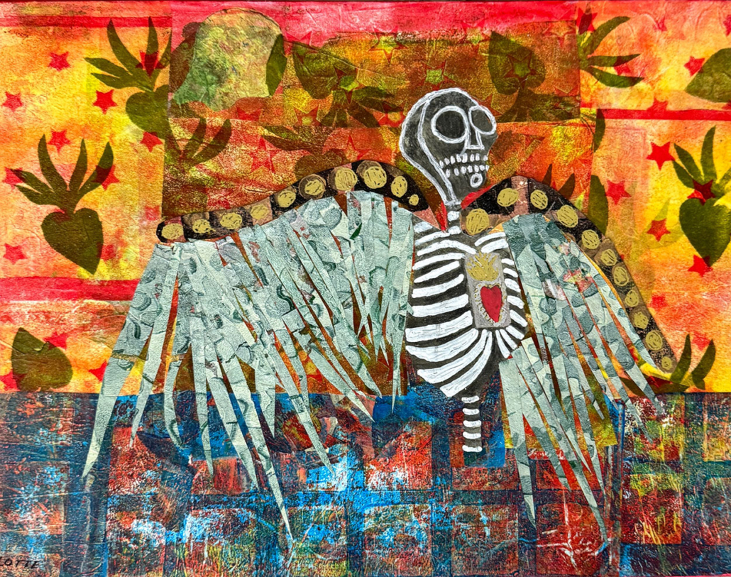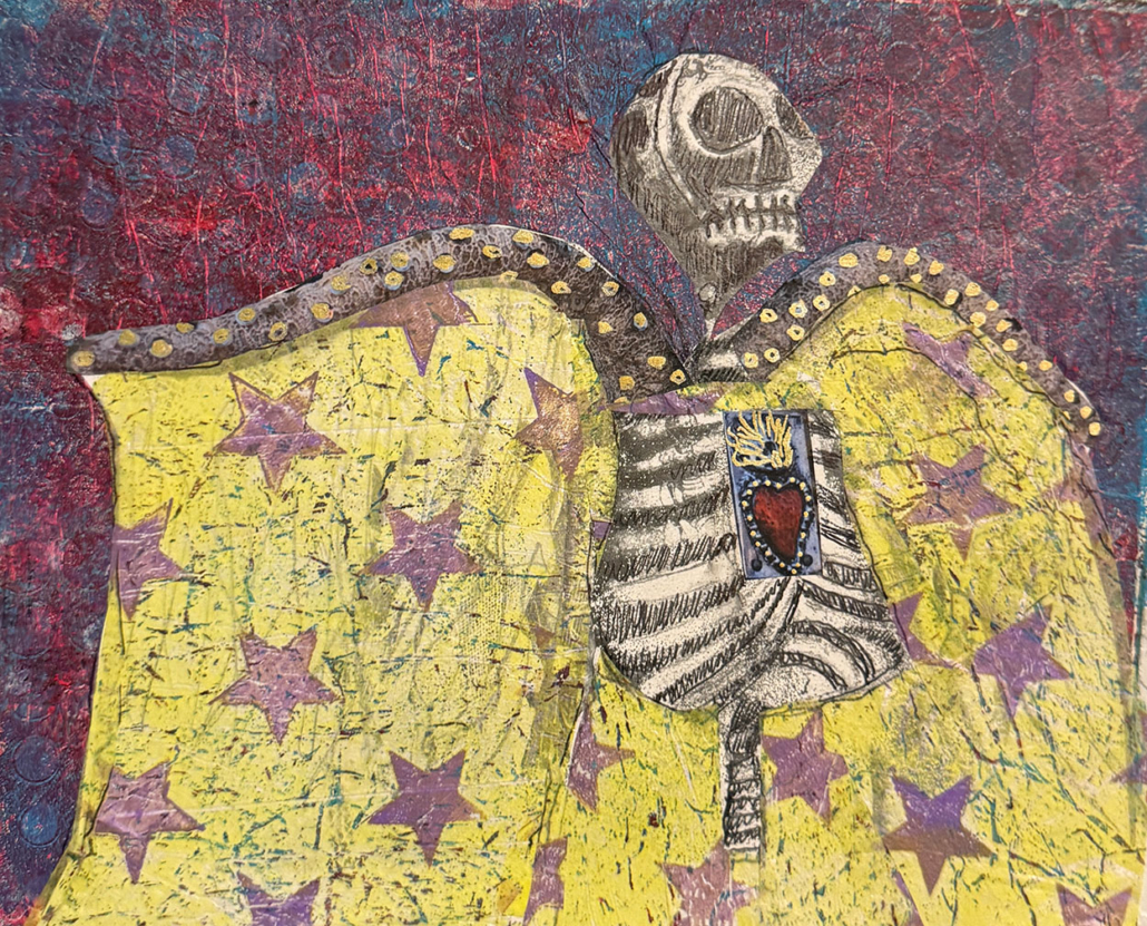 The mixed media pieces on this page are based on a photo of a skeleton that I saw and photographed several years ago in Mesilla Vieja. I used the gel plate to create photo transfers which I embellished with collage papers, also created on the gel plate.